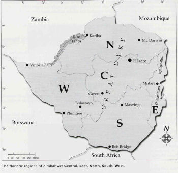 In Flora Zambesiaca, Zimbabwe was divided into 5 divisions based on groupings of administrative districts. These are labelled in accordance with the points of a compass with C, the Central division, surrounded by 4 others. N, W, E and S). The 5 divisions are shown on the following map.