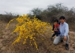 Arthit and his child admiring a profusely flowering specimen of Rhigozum zambesiacum.