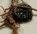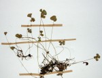 Floating form: stipe up to 14 cm long. Leaflets up to 35 mm long, outer margin uneven with shallow indentations. Dry land form: stipe 1.5-6 cm long. Leaflets up to 7 mm long, outer margins entire to very shallowly irregular. Sporocarps: usually single, or crowded at stipe base; very glossy, shiny black, with a few flattened scales when young becoming glabrous with age, smooth with minute dots, with the black outer layer becoming detached and peeling; broadly to narrowly deltate in lateral view, vertical cross-section elliptic; lower tooth absent, upper tooth a slight hump. Sporocarp with its long axis pointing downwards; pedicels up to 3 mm long, free, arising from the axil of the stipe. |