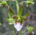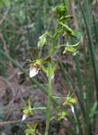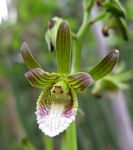 Terrestrial herb, up to c. 70 cm tall. Pseudobulbs mostly above ground, 6-14 cm long, cylindric to narrowly conical. Leaves 4-5, linear, up to 38 × 1.5 cm, leathery; margin finely toothed. Inflorescence unbranched, laxly up to 20-flowered. Sepals olive-green, more or less tinged purple-brown; dorsal sepal erect; lateral sepals somewhat spreading, turned back at the tips. Petals striped green and purple, more or less pointing forward, curled back at the tips. Lip 16-20 mm long, obscurely 3-lobed, greenish near the base, white on the apical half with purple veining on the sides and 3 crests of papillae down the centre; margin irregularly crisped. Column purple, 9-11 mm long. Spur 3-5 mm, cylindric, bent forwards. |