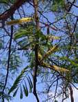 Medium to large deciduous tree. Prickles in opposite pairs, short, broad and hooked. Flowers in long slender spikes, cream to pale yellow, the calyces showing red before the flowers open. The pods are long, up to 25cm, flat and hairless. |