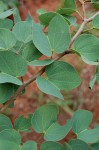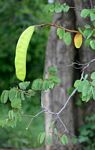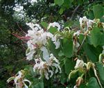 Large bush or small tree. Leaves in a characteristic hoof-shape, 2-lobed for more than half the length, normally 7-veined from the base. Flowers in large, showy terminal clusters; petals snow-white, long narrow and usually wrinkled. Stamens and style reddish, long exserted. Pods flattened and woody, splitting explosively when ripe. |