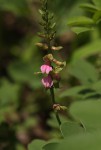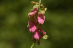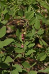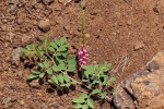 Shrubby perennial herb with spreading or ascending branches, up to 1 m tall but usually shorter, growing from a woody rootstock. Stems. Stems more or less 4-angled or flattened, often densely appressed silvery hairy. Leaves pinnate with 5-8 broadly elliptic to obovate leaflets; terminal leaflet largest, 1-4 cm long. Inflorescence a raceme 5-30 cm long, including the peduncle. Flowers bright pink with the standard greenish to yellowish with pink stripes. Pods cylindrical to 4 angled, spreading or reflexed, mostly 18-36 mm long, straight or curved to sharply bent at the base, densely appressed hairy. |