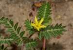 Prostrate annual herb. All parts covered in long whitish hairs. Leaves opposite paripinnate, one leaf in a pair often longer than the other. Peduncle shorter than or as long as, the subtending leaf. Flowers solitary in leaf axils. Petals 3-8(-12) mm, light yellow. Fruit a hard triangular drupe with sharp spines. |