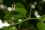 Medium-sized to tall deciduous tree, large specimens often with a fluted trunk. Branches distinctly zig-zagging, armed with green forked spines. Leaves 2-foliolate; leaflets asymmetrical ovate to almost round, dark grey-green, leathery, velvety when young; margin entire. Flowers in axillary clusters on mostly unarmed branches, c. 2 cm in diameter, yellowish-green; petals densely hairy on the outside. Fruit date-like, grooved along the length, yellowish when ripe, edible and rich in oil. |