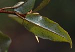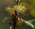 Shrub or small tree. Bark roughish dark grey with watery sap; young branchlets reddish, covered in glandular scales. Leaves sub-opposite or whorled, elliptic to lanceolate, 1-8 cm long, aromatic when crushed, dark green and hairless above, densely covered in silver-white scales below often with numerous reddish-brown glandular scales; margin entire, rolled under. Flowers in spherical heads, pale creamy-yellow, unisexual, in the same or different heads on the same tree. Fruit a 3-lobed capsule, c. 10 mm in diameter, covered in pale yellowish-grey scales. |