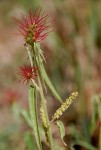 A bushy perennial, which may grow up to 2m but is usually much smaller. Leaves distinctly petiolate and covered in long, silvery hairs. Male and female flowers normally on the same plant (see photo), the male spikes pale greenish yellow, situated in the leaf axils; the female flowers terminal with a crown of bright red hair-like styles. |