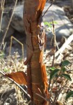 Woody, unarmed shrub or small tree. Bark smooth, shiny, olive-green with brown papery strips peeling off. Leaves oblong-elliptic, 3.5-5.5 cm long with widely spaced, yellowish veins; margin entire, petiole up to 12 mm long. Flowers in subsessile clusters along the branches, yellowish-green. Fruit a 3-lobed capsule, c. 8 mm in diameter, blue-green. |