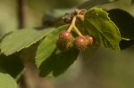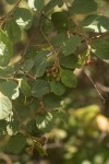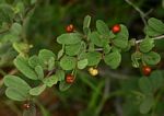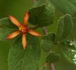 Dense multi-stemmed shrub, up to 2 m tall, occasionally a taller small tree. Bark dark grey-brown; young branches velvety, becoming dark purple-black. Leaves alternate, often held upright, elliptic to oblanceolate-obovate, up to 7 × 2.5 cm, 3-veined from the almost symmetric base, grey-green above, paler below, finely hairy on both surfaces or more so below; margin finely to somewhat coarsely toothed. Flowers yellow fading to orange-brown, 1.5 cm in diameter, solitary or in few-flowered axillary heads. Fruit spherical or 2-lobed, c. 8 mm in diameter, reddish-brown when ripe, edible. |