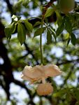 Massive tree, not usually more than 20 m, but with a trunk up to 10 m in diameter. Stipules caducous. Leaves crowded at the ends of branches with a distinctive slightly unpleasant smell when crushed. Leaves (on very young plants) simple and sessile or 3-foliolate and petiolate (both types may be present together), entire or shallowly dentate. (See image no. 4). Leaves (on mature trees) 5-7-foliolate, palmate with petiole up to 12 cm. Leaflet lamina (mature trees) 5-15 × 3-7 cm, oblong-elliptic to obovate-elliptic, covered below when young with stellate hairs or glabrous. Flowers usually pendent. Petals 6(-10) × 7(-12) cm, white. Fruit up to c.25 × 12 cm, ovoid to oblong-cylindric, variable and sometimes irregular in shape, velvety-brown-tomentose. Seeds c.1.3 × 0.9 cm, many, reniform. |