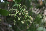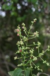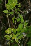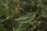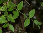 Scrambling unarmed shrub or small tree. Young branches green with greyish hairs. Leaves oblong-elliptic to subcircular, 2-5 cm long, pale to mid-green, rather thick and fleshy, sometimes with gland dots seen against the light; apex with a sharp point; base running into the very short petiole. Flowers greenish-white, very small in loose branched terminal and axillary heads. Fruit ovoid 5-10 mm long, pink to red when ripe, edible with a sweet but peppery taste. |