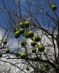 Shrub or small deciduous tree. Bark rough and flaking but not deeply fissured and corky. Branches often armed with curved or straight spines, not always clearly visible. Leaves opposite, elliptic, oblong to ovate, 3-7-veined from the base, variably hairy or hairless. Flowers borne on small lateral spur-branchlets or terminally, in small compact heads, creamy-green. Fruits spherical, up to 12 cm, hard-shelled, speckled-green, turning yellow-brown, edible and tasty but are said to be not as good as those of Strychnos cocculoides. |