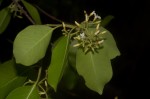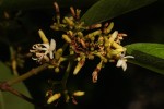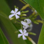 Shrub or small deciduous tree with a drooping appearance. Bark rough and deeply fissured. Leaves opposite, elliptic, shiny yellowish green, pointed at the apex; pale yellow midrib and lateral veins conspicuous. Flowers white to cream in loose clusters near the ends of branches, sweetly scented. Fruit often in paired, woody, boat-shaped pods, beaked at the apex, dark brown, heavily dotted with pale lenticels.