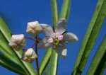 Shrubby perennial herb, usually branching from near the base. Stems woody near the base, densely pubescent. Leaves opposite, linear to linear-lanceolate, 4-12 cm long, leathery, more or less densely pubescent and with soft white hairs on the midrib and margins, pointed and mucronate at the apex; margin often rolled under. Flowers in extra-axillary, 4-12-flowered nodding umbels. Corolla reflexed, white or cream; corona lobes attached c. 1.5mm above the base of the staminal column, cream to green, more or less as tall as the column, laterally compressed. Follicle erect on a twisted pedicel, ovoid, inflated, up to 7 × 2.5 cm, distinctly beaked, more or less densely covered in soft bristles. |