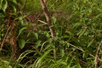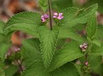 Perennial herb or small shrub, up to c. 1.5m tall. Stems woody at the base, somewhat 4-angled; branchlets with long, tubercle-based whitish hairs, spreading bristles and scattered sessile glands. Leaves mostly opposite, rarely 3-whorled, petiolate, more or less broadly ovate, 3-9 cm long, light green, somewhat bristly with tubercule-based hairs and impressed venation above, paler and more densely softly hairy with raised venation below; margin with 16-28 teeth. Inflorescences in axillary ovoid spikes, up to 15 cm long, with leaf-like overlapping bracts. Flowers lilac, mauve, pink or purple with a yellowish throat; corolla tube 5-6 mm long. Fruit a drupe, c. 3.5 × 3 mm, lilac to dark purple hen ripe. |