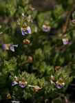 Decumbent, much-branched herb, up to 20 cm. Leaves ovate, glandular-pubescent, apex acute, base slightly cordate, sessile or very shortly petiolate (1 mm). Flowers in axillary pedunculate clusters of 1-several flowers, subtended by bracts, which resemble the leaves. Calyx lobes 5, connate below, one spathulate, 5-6 mm and c.3 mm wide, the other 4 linear, slightly shorter. Corolla ± erect, c.1 cm; upper lip erect, pale purple to almost white, lower lip reflexed with 3 lobes, purple with orange-brown bulges at the throat. Stamens 4. Capsule linear, pubescent. |
