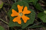 Perennial scrambler or climber. Stems annual, prostrate or scandent, growing from a tuberous rootstock. Tendrils simple. Leaves shallowly 5-lobed with short triangular lobes, giving the leaf a near-pentagonal outline. Base deeply cordate. Flowers solitary, axillary, unisexual on the same plant. Peduncles adnate to the leaf petioles, each flower appearing to arise from a leaf. Corolla bright orange; lobes obovate-obcuneate, bilobed. Male flowers 3.5-6 cm in diameter, much larger than female flowers. Fruit small, fusiform, ribbed, pubescent particularly on the ribs. |