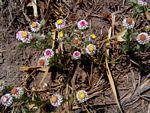 Low annual herb with a long taproot and radiating prostrate branches, up to 25 cm long. Leaves spathulate to oblanceolate, up to c. 2.5 cm long, thinly grey-woolly on both sides. Capitula solitary at the end of branches. Involucral bracts c. 9-seriate, up to 7 mm long, silvery white, turning pink at the centre. Florets yellow, often pink-tipped, turning brown with age. |